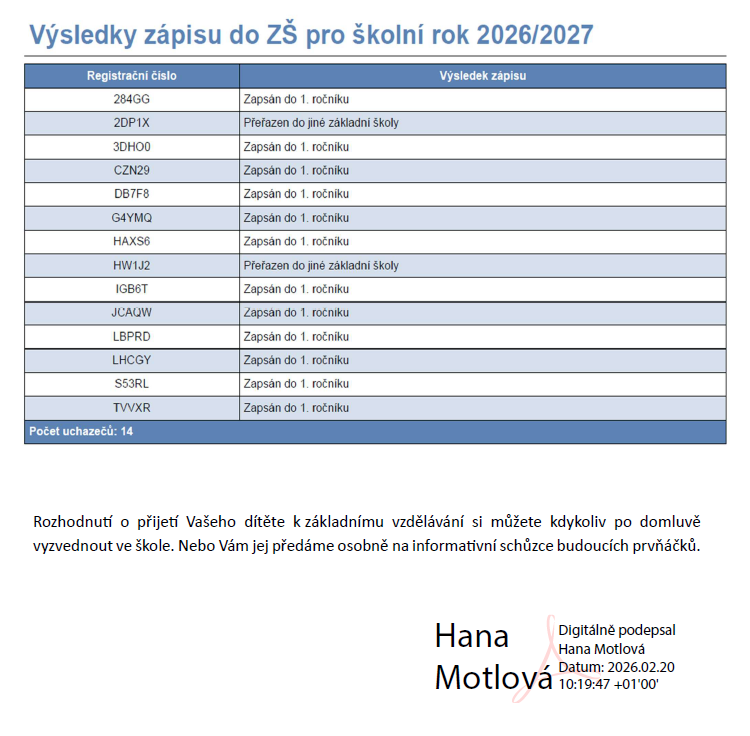 Na anonymní výsledky se můžete podívat zde. Rozhodnutí o přijetí si můžete vyzvednou kdykoliv ve škole po předchozí domluvě nebo Vám jej předáme na informativní schůzce budoucích prvňáčků, která proběhne v červnu. Těšíme se na nové prvňáčky🙂