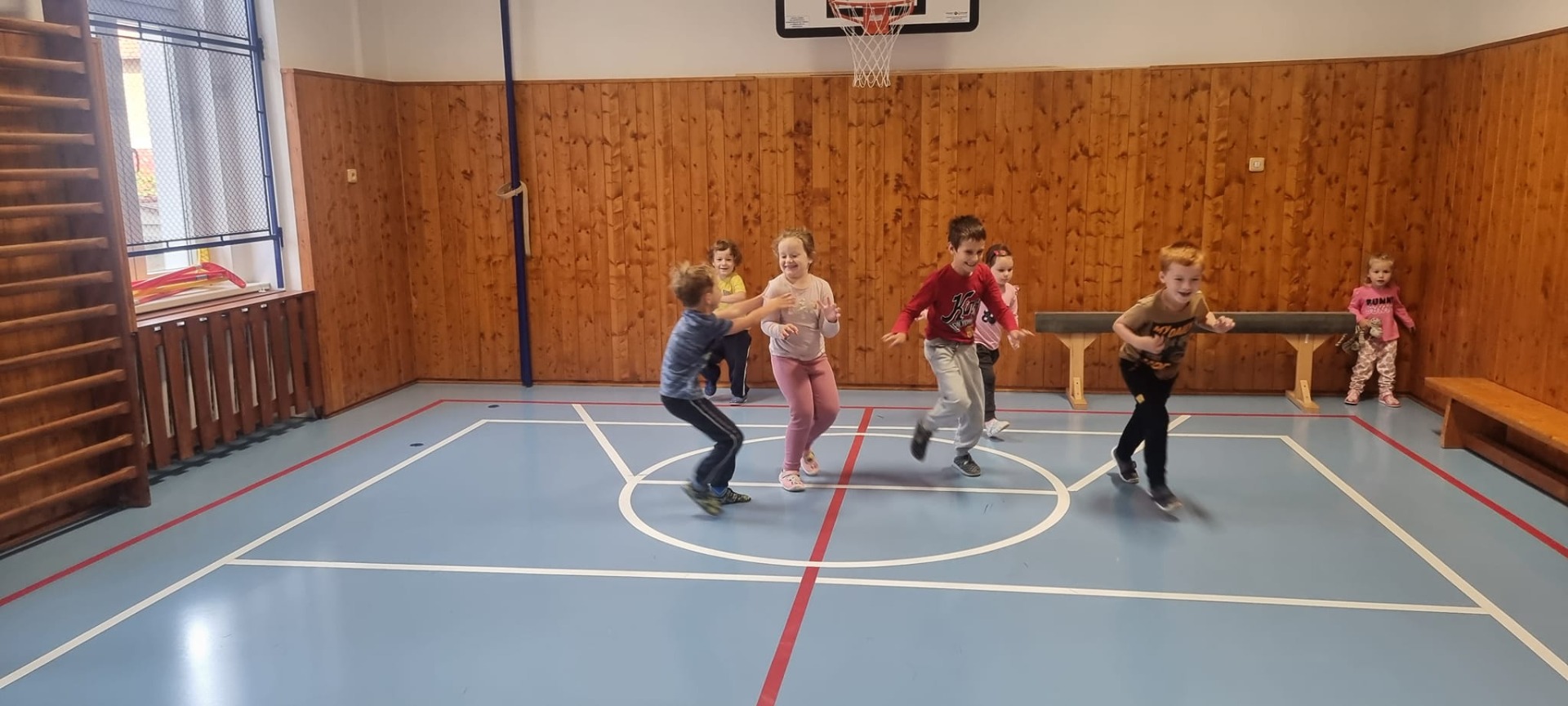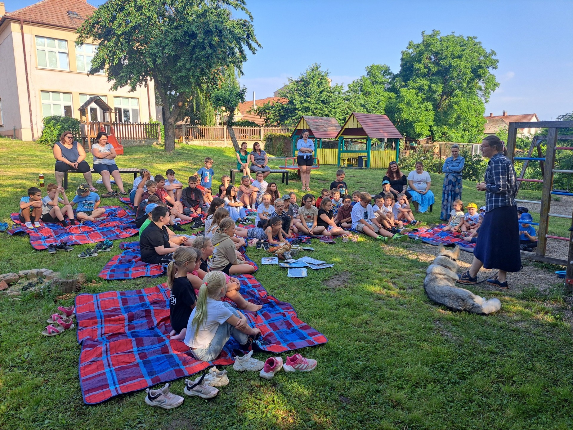 Malá, ale parádně zařízená. Když to počasí dovolí, jsme venku na místním hřišti u lesa.