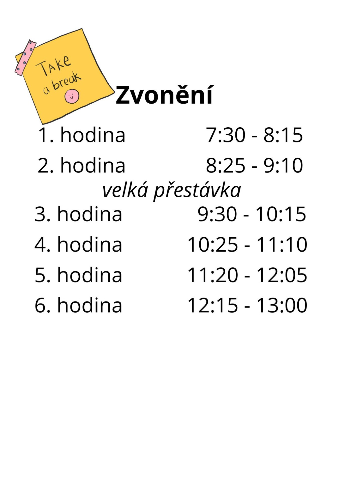 Jelikož nám většina dětí dojíždí z okolních vesnic, máme upravený začátek a konec vyučovací doby.